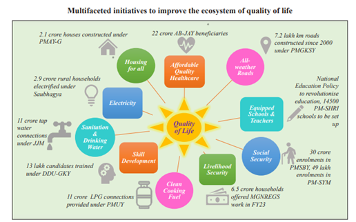 - Rural housing: by 2024, all eligible houseless households residing in kutcha and dilapidated dwellings in rural areas will receive around 3 crore pucca houses with essential amenities.
