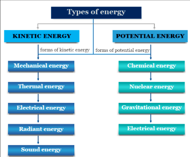 There are various forms of energy but energy is either potential energy or kinetic energy.