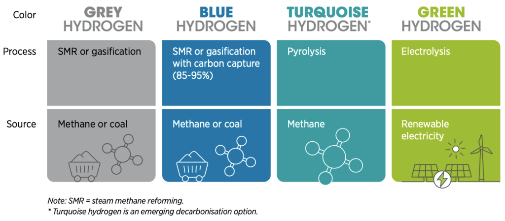 The production of green hydrogen involves splitting water molecules (H2O) into hydrogen (H2) and oxygen (O2) using electricity. Hydrogen can be produced in a variety of ways on an industrial scale. These include coal gasification, oil reforming, and natural gas reforming using steam.