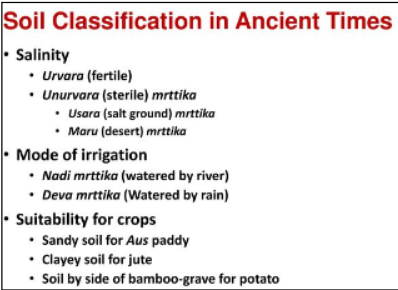 Soils were categorised in the 16th century A.D. based on both their inherent qualities and external features like texture, colour, slope of the land, and moisture content in the soil.