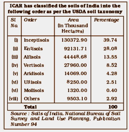 - Later, the Indian soils were categorised by the ICAR using the United States Department of Agriculture's (USDA) Soil Taxonomy based on their nature and characteristics.