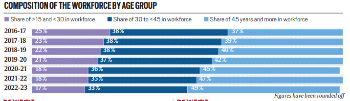 - Remarkable Workforce Ageing: Over just seven years, the workforce's age distribution has experienced significant change. The proportion of individuals aged 45 and above has surged from one-third to nearly half, underlining the speed at which the workforce is ageing.
