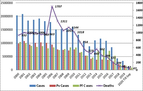 Remarkably, India achieved an impressive 83.34% reduction in malaria morbidity and a remarkable 92% reduction in malaria mortality between 2000 (20,31,790 cases, 932 deaths) and 2019 (3,38,494 cases, 77 deaths), successfully accomplishing Goal 6 of the Millennium Development Goals, aiming for a 50-75% decrease in case incidence between 2000 and 2019.