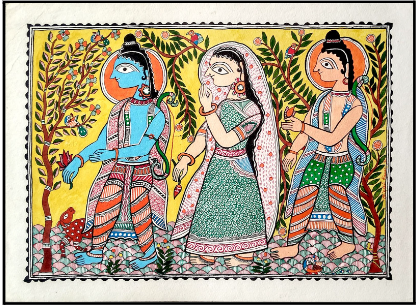 - Mythological Depictions: Madhubani paintings often revolve around Hindu legendary characters like Krishna, Rama, Lakshmi, Shiva, Durga, and Saraswati, depicting their life stories.