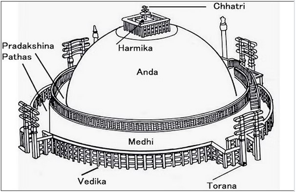- The Anda refers to the hemispheric dome of the stupa, housing the Buddha's relics, while atop it lies the harmika, a square railing, and the chhatra, an umbrella symbolizing protection.