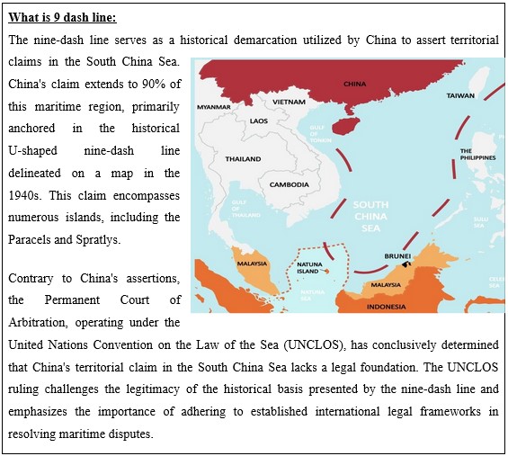 China's territorial claims are notably asserted through its "nine-dash line" map, encompassing up to 90% of the South China Sea. This expansive claim has led to heightened tensions in the region. China has not only claimed vast territorial waters but has also engaged in physical expansions, particularly in the Paracel and Spratly Islands.